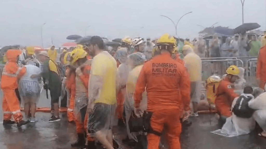 Com a chuva intensa, parte do público buscou abrigo improvisado. Pessoas desacordadas foram carregadas até a única ambulância disponível, que rapidamente ficou cercada por participantes da caminhada. Algumas vítimas demonstravam sinais de desorientação e precisaram ser amparadas por familiares e outras pessoas próximas.