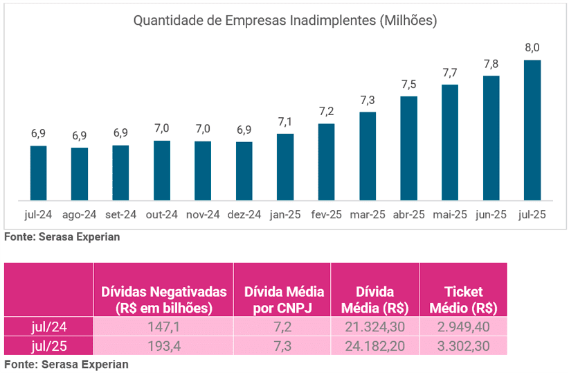 Em 2025 a inadimplência das empresas, segundo o Serasa Experian, bateu o recorde da série histórica e chegou aos 8 milhões de CNPJs nesta situação, um aumento de mais de 200 mil negócios e de 1,1 milhão na comparação com 2024, segundo os dados do Indicador de Inadimplência das Empresas, a primeira e maior datatech no país. O tícket médio das dívidas também atingiu a máxima histórica da série, R$ 3.302,30 – com média de 7,3 dívidas por empreendimento. Juntas, todas as dívidas somam R$ 193,4 bilhões.